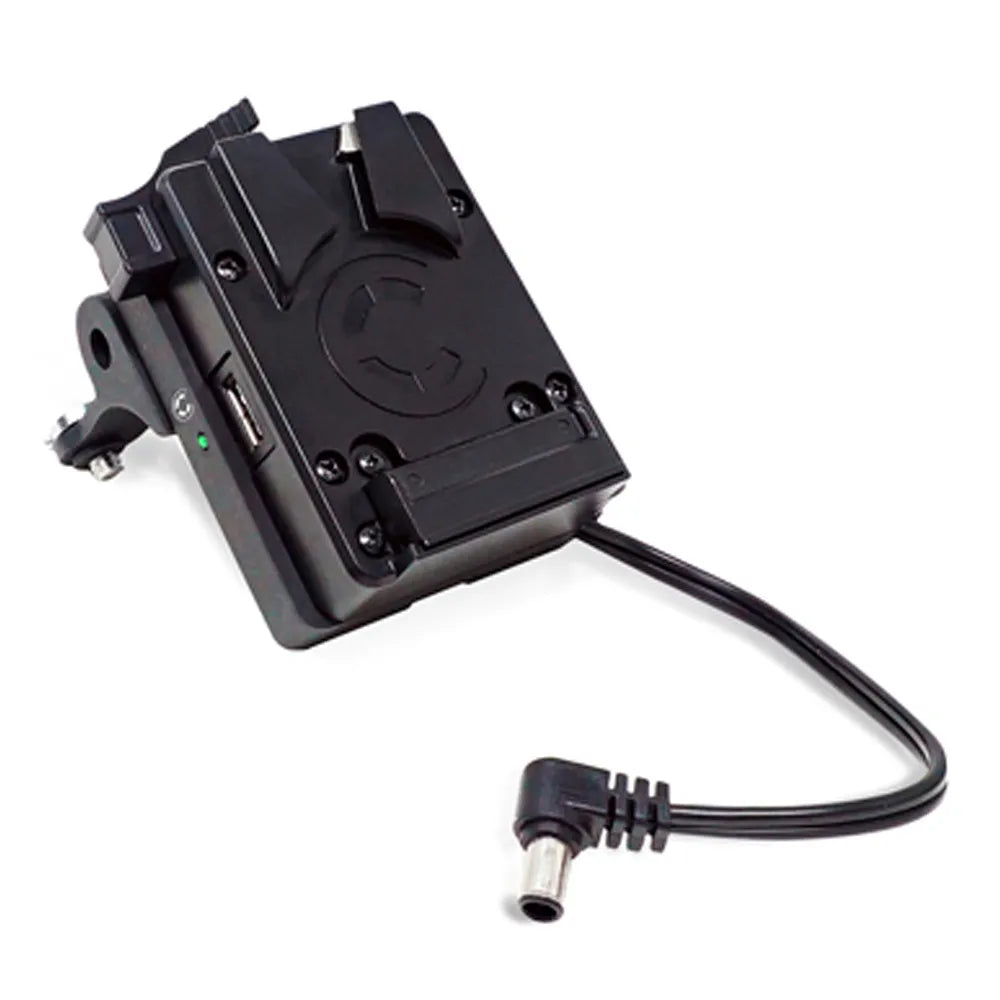 The CXVM-FX6 mounts directly to the back of the Sony PXW-FX6. The milled aluminium product inserts into the battery slot of the camera and also attaches into the top of the camera(with included screw hardware) to provide a secure platform for mounting v-mount batteries directly onto the FX6 camera. It has a 19.5v DC output with a visual low battery warning LED and a DC barrel input (OEM camera power supply) for hotswapping between external and on-board power. In addition, it’s equipped with a powertap and USB to power additional accessories. A USB firmware update port on the rear ensures future compatibility with camera firmware updates.