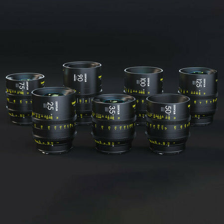 This DZOFilm VESPID 7-Lens Kit B is suitable for use on productions ranging from independent to studio films. The included 25, 35, 50, 75, 100, 125, and 90mm macro EF mount lenses cover full-frame sensors and project a 46.5mm image circle yet are small and lightweight, making them an excellent choice for handheld, gimbal, and drone work.