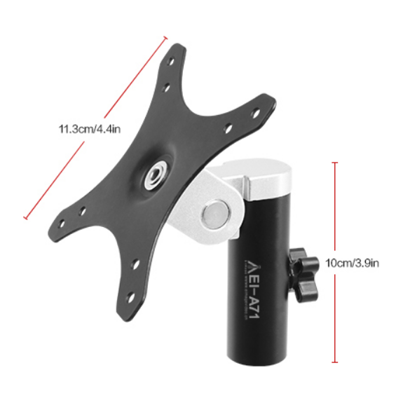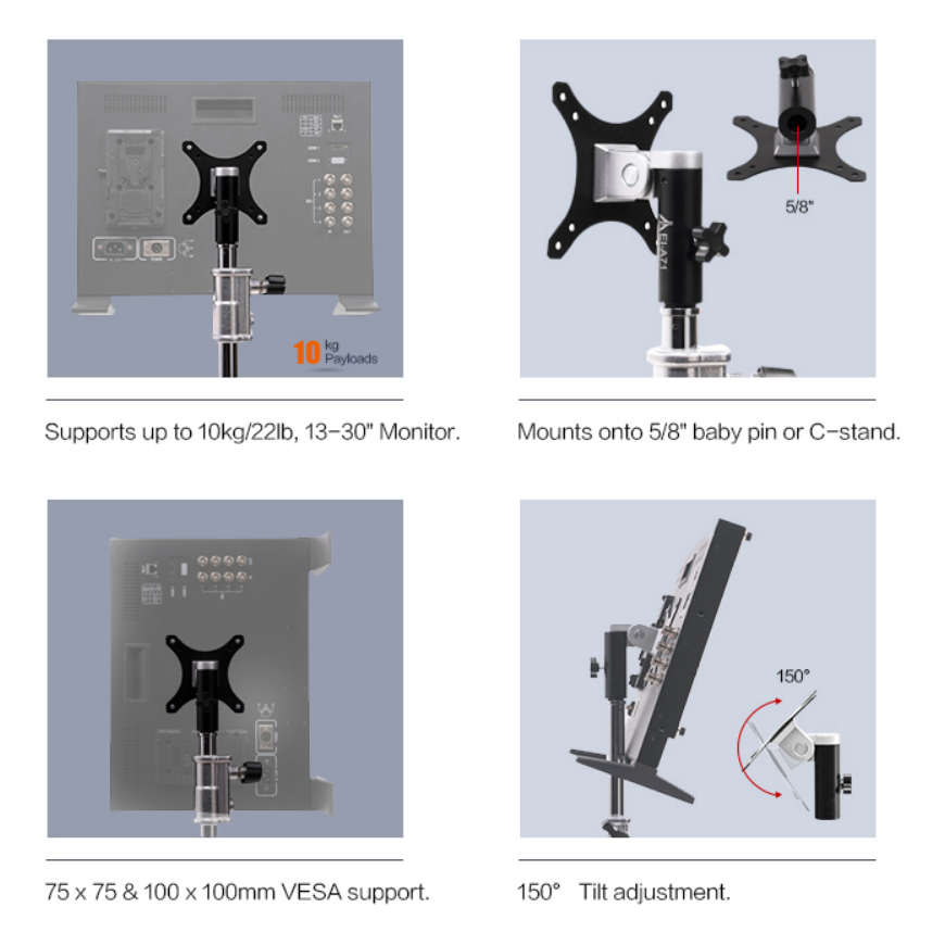 Quickly mount and remove your video monitor from a C-stand or another 5/8" Baby pin support using the VESA to 5/8" Baby Pin Adapter from E-Image. This durable aluminium adapter supports monitors between 13 and 30" weighing up to 33 lb and has a tilt function for optimal positioning.