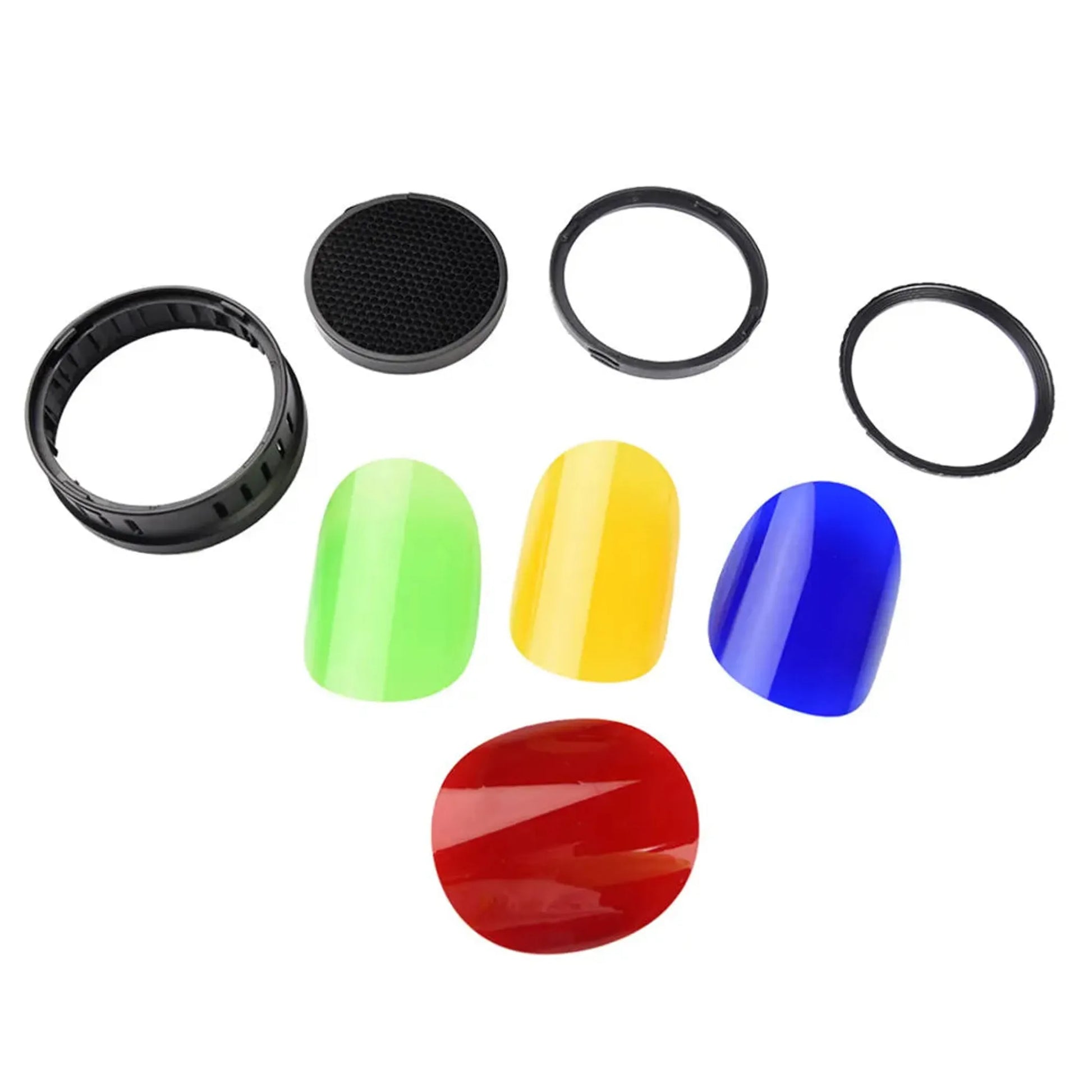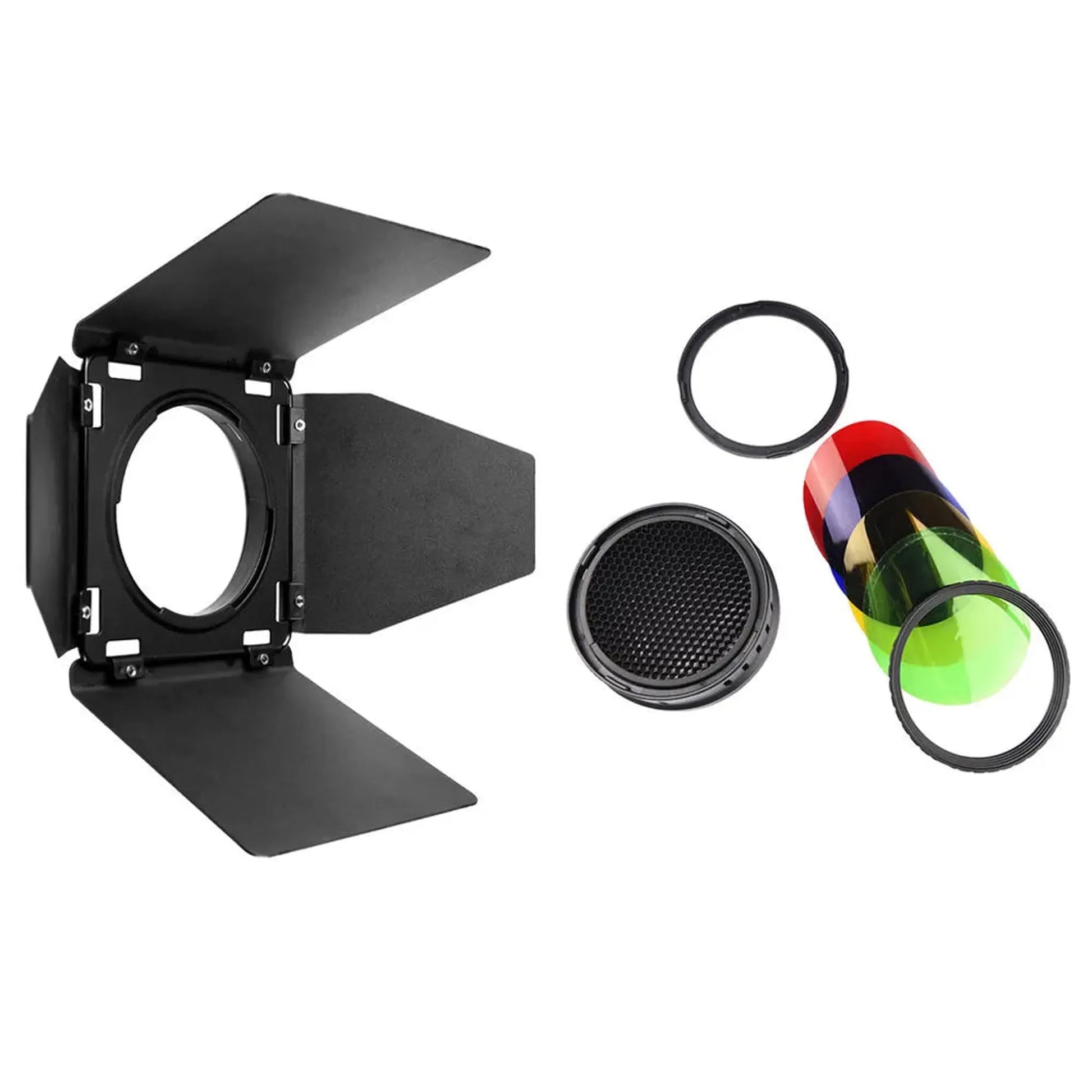 The Godox AD400Pro Outdoor Flash Barndoor Kit includes a 4-way barndoor set, honeycomb grid, and individual green, blue, red, and yellow filters. Utilize the barndoors to control light precisely, illuminating desired subject areas while shading unwanted ones. The honeycomb grid narrows the beam spread into a soft-edged circle, making it perfect for hair lighting and focused effects. For artistic expression, the color filters offer a range of creative possibilities.