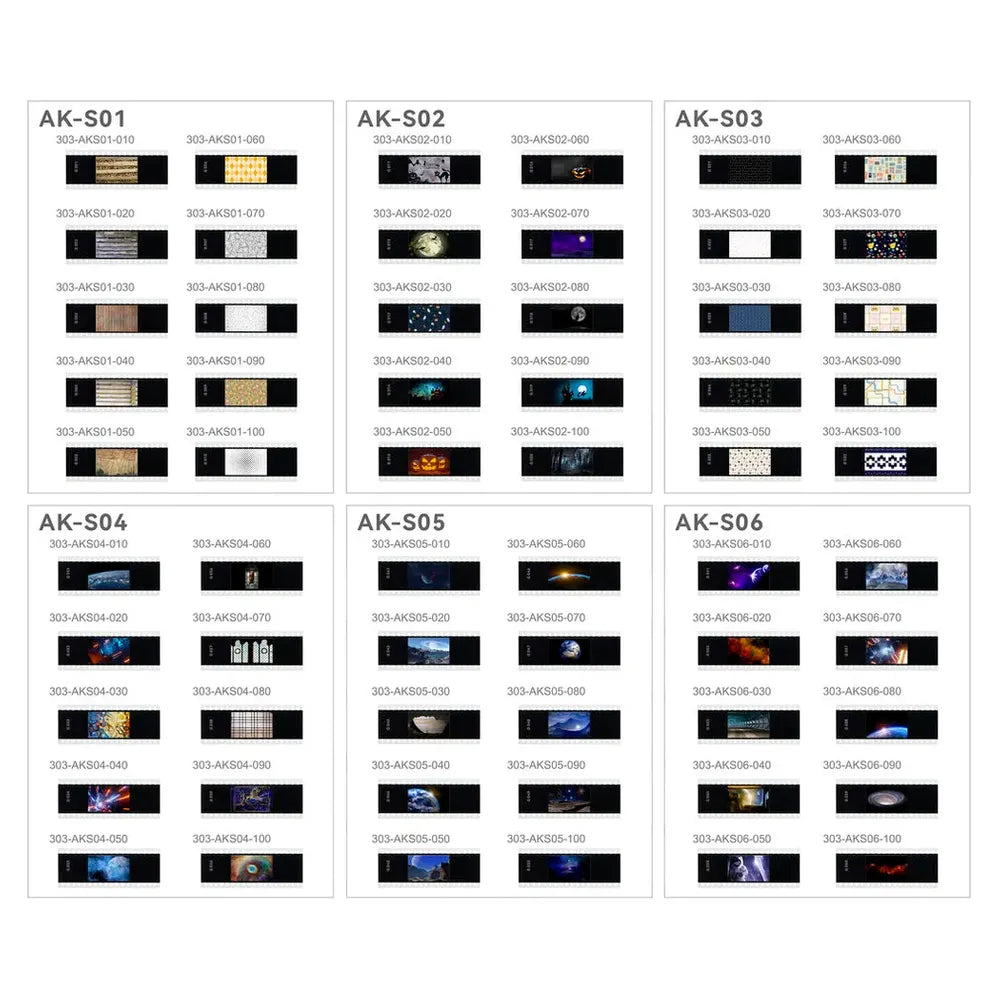 This Godox Slide Kit is designed for the AK-R21 Projection Attachment and contains 6 unique slide sheets, each of which contain 10 unique slides. With this kit you are able to create 60 different lighting effects with the included slides.