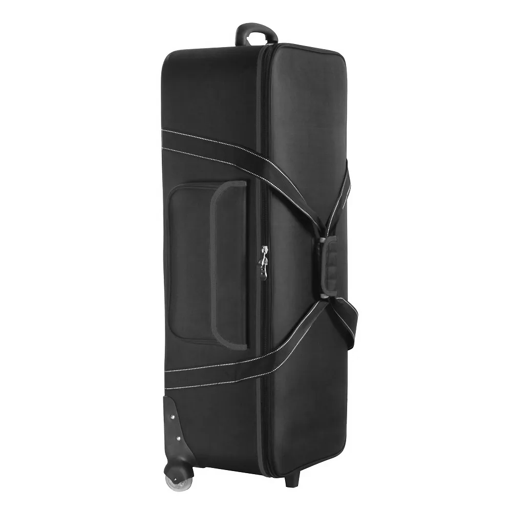 The Godox CB-06 Wheeled Light Stand and Flash Carrying Bag is designed to securely store, transport, and safeguard photo gear up to 94cm long. Its black nylon construction ensures durability, and the zipper closure offers easy access. The bag comes equipped with dual, connecting top strap handles and a top haul handle for convenient carrying. Built-in wheels allow for effortless transportation, while the rubber foot ensures stability in an upright position. Additionally, corner guards provide added protection from impacts and fabric abrasion, making this bag a reliable and practical choice for your equipment.