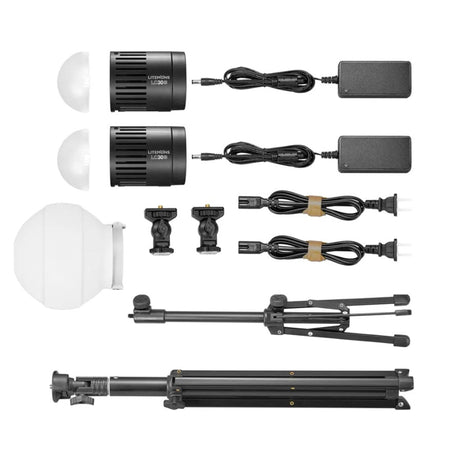 Lightweight and portable, the Litemons LC30D Tabletop LED Two-Light Kit from Godox is a versatile and efficient lighting solution for content creators, tabletop product shooters, vloggers, and more. An intuitive and budget-friendly LED lighting system, the LC30Ds make it easy to set up and illuminate your shooting area. The fixtures provide bright and dimmable lighting for small product photography and tabletop livestreaming, and the lights' high CRI and TLCI ratings of 95 and 96 produce highly accurate color renditions and realistic skin tones. Also included in this kit are two small diffusers, a large diffusion dome, a desktop tripod, and a traditional tripod. Together, all these tools allow you to configure your lighting setup and camera placement for maximum creative effect.