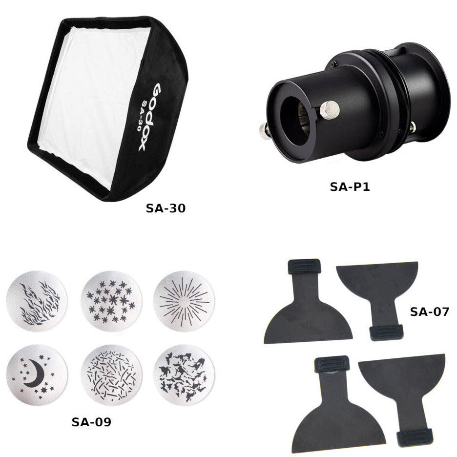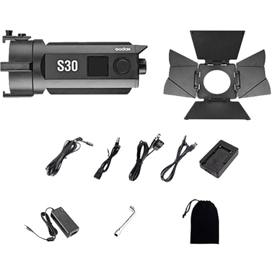 The S30 LED Focusing LED Light from Godox is a lightweight, versatile source with light intensity, beam spread, and power options. The output can be further controlled by swinging one or more leaves of the 8-way Barndoors into the beam path to facilitate selective lighting.