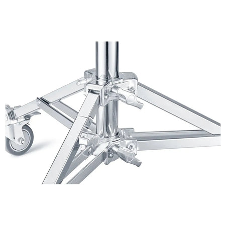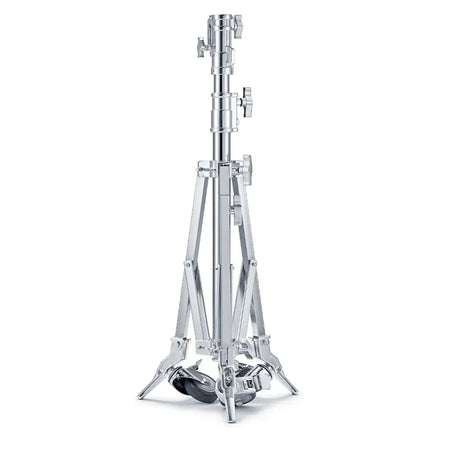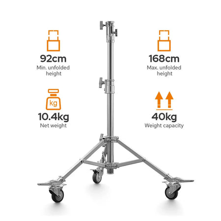 The compact and robust Godox Heavy-Duty Steel Roller Stand, measuring 1.68M, presents an excellent solution for securely accommodating equipment weighing up to 40kg. Crafted from durable metal, this stand offers a minimum working height of 92cm and features a retractable 5/8" pin with a 1 1/8" receiver. With the stand's reliable braked wheels, weighing 10.4kg, you can rest assured that both the stand and any mounted equipment remain securely in place.