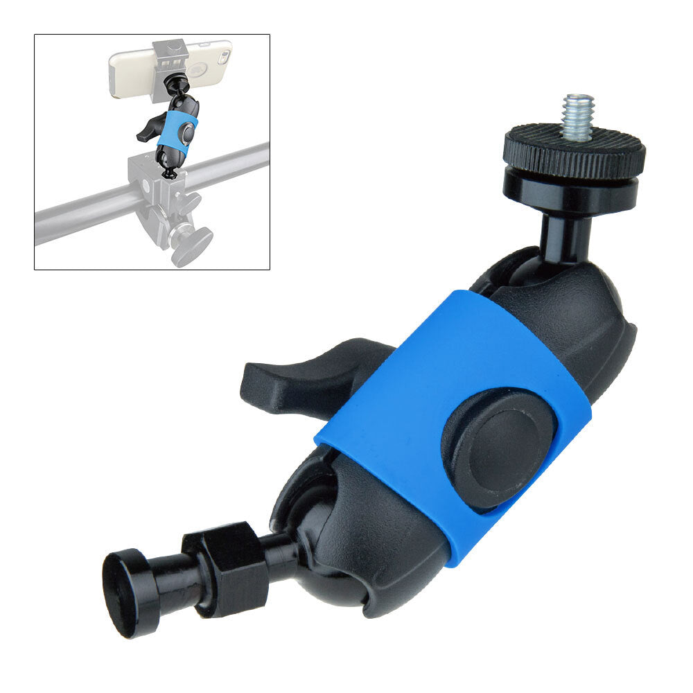 1-2. Angle adjustable in all directions. / 3. The blue silicon rubber sleeve holds the double socket arms tightly to avoid them being taken apart while loosening the knob for adjusting the angle or exchanging the ball heads. / 4. Hard anodized ball head with serrated surface treatment. / 5. The serrated surface treatment increases the friction of the ball joint. / 6. Exchangeable ball heads and double sockets offer an ultra-versatile mounting solution.