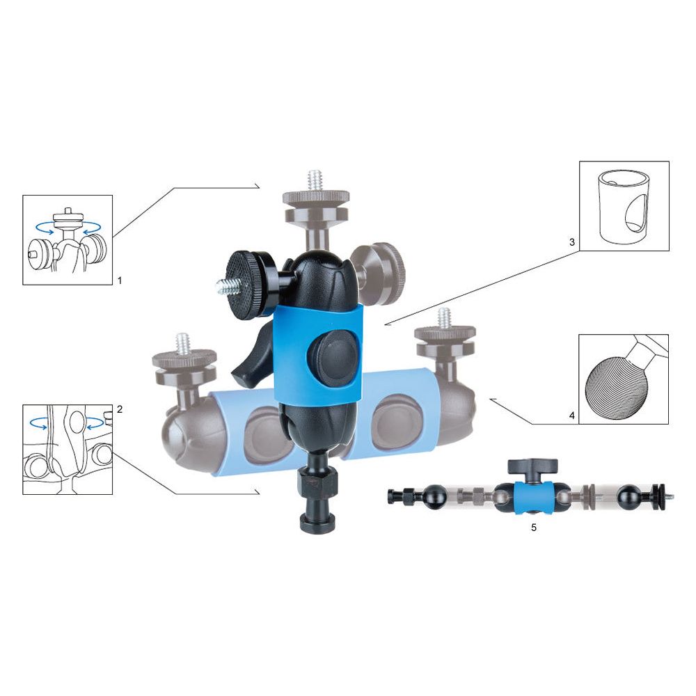 Attached to one ballhead is a 1/4" thread with a locking collar.