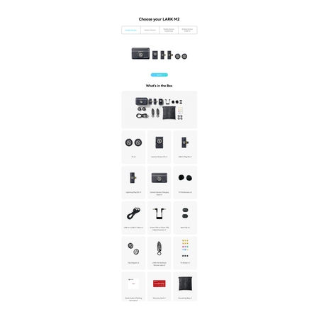 The LARK M2 comes with a bundle of useful accessories, including windscreens for outdoors recording, cable connectors for easy connectivity, and a specially crafted necklace for each TX. With these accessories, You'll have everything you need to set up your LARK M2 and enjoy its features.