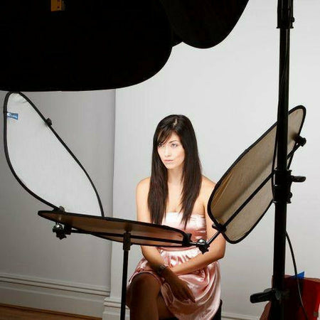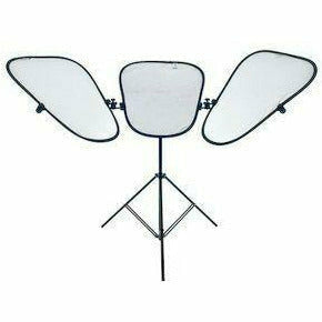 The Triflector MkII is widely used in makeover and fashion shoots because of the distinctive 'catch lights' the subject receives to the eyes. The hinge mechanisms make all three panels individually adjustable to get light exactly where you need it. The panels each fold like our collapsible reflecting panels. The frame folds away and they all fit into a portable bag. Triflector MkII weighs only 1.2kg.