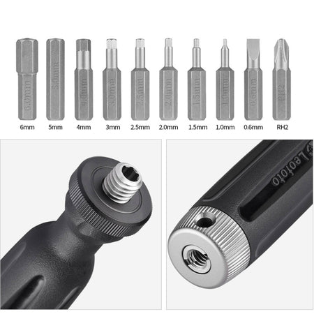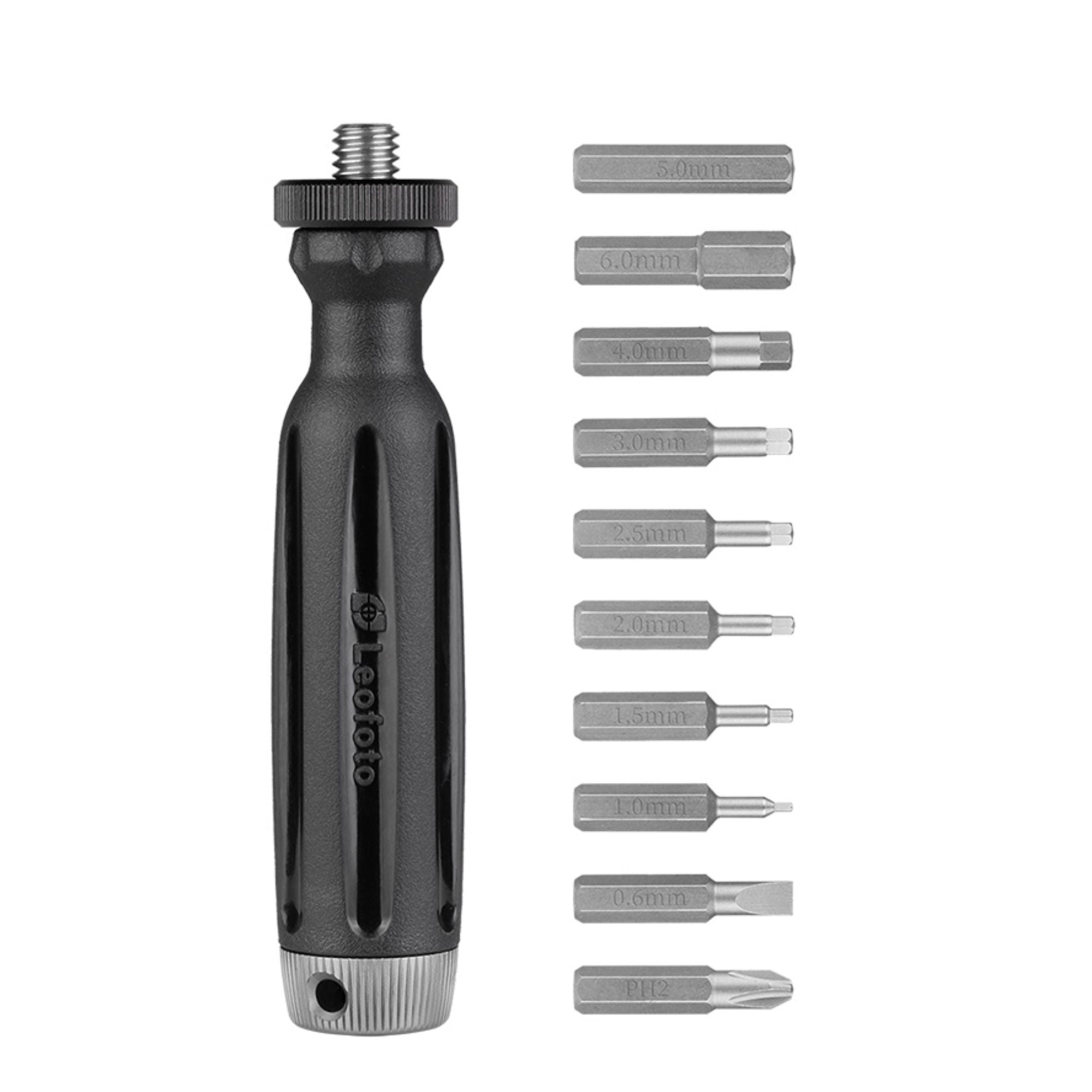 \nThe Leofoto LMT-10 Multi-Tool Kit is designed to provide photographers with a reliable and versatile tool for maintaining and adjusting their equipment. The kit includes a variety of tool bits, all neatly stored within the handle of the multi-tool, ensuring that you have everything you need at your fingertips. \n \nThe high-strength steel construction of the tool bits guarantees durability and precision, allowing you to perform even the most delicate adjustments with confidence. The compact design of the LMT-10 makes it easy to carry with you wherever you go, ensuring that you are always prepared for any situation. \n \nThe multi-tool's handle is ergonomically designed for a comfortable grip, and the integrated storage compartment keeps the tool bits organized and easily accessible. The 3/8" stud and 1/4" mounting thread compatibility make it easy to attach the tool to various photographic equipment, enhancing its versatility and convenience. \n \nWhether you are tightening a tripod leg, adjusting a camera plate, or performing routine maintenance, the Leofoto LMT-10 Multi-Tool Kit provides the tools you need to get the job done quickly and efficiently. This multi-tool kit is an essential accessory for any serious photographer or videographer, ensuring that your equipment remains in optimal condition at all times. \nPackaging and Accessories: