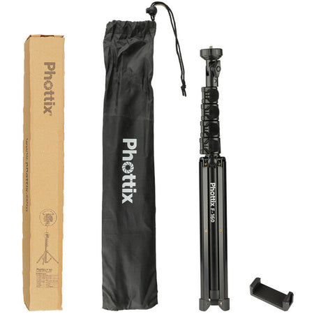 The Phottix Stand Light F-160 is perfect for live streaming, selfies, and vlogging. Its 5 column sections quickly lock in place to extend from 18.3in (46.5cm) to 63in (160cm), and its compact design makes it light and portable for easy transport. Its unique head has a flexible 1/4" screw for 360 degree vertical rotation, 180 degree horizontal rotation, and a spring-loaded smartphone clamp that extends up to 4" wide. The F-160 includes a universal phone clamp and a packing bag.
