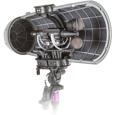The Stereo Cyclone Windshield features an open-shell structure, curved contours, and no straight or parallel surfaces. It delivers a clean frequency response with reduced room-tone effects that characterize conventional tubular designs. Covered with 3D-Tex material and featuring an aerodynamically efficient, asymmetric shape, the basket provides wind-noise reduction comparable to the combined, modular-style, windshield-and-fur cover performance.